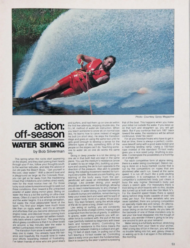 “The transition from snow to water skiing is an easy one to make. You already have the balance, and hopefully the muscle tone to make your efforts rewarding instead of frustrating,” says Vol. 6, Issue 6.